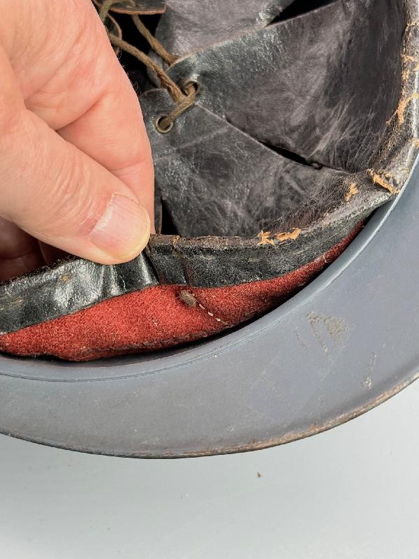 Coiffe en cuir du premier type avec bandeau de laine garance. Jugulaire présente mais refaite.