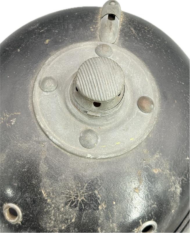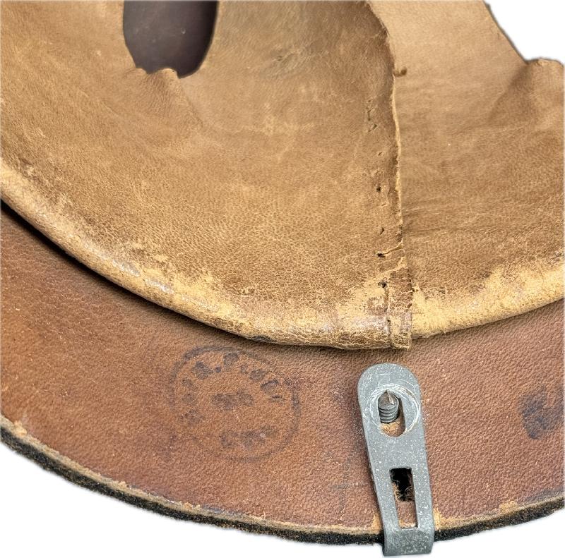 Belle bombe en cuir vernie non déformée, coiffe en cuir fauve avec marquage du fabricant dans la nuquière et daté 1915. Il manque l'écrou de fermeture sur le jonc arrière. Bonne pointe fer à baïonnette.
