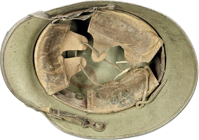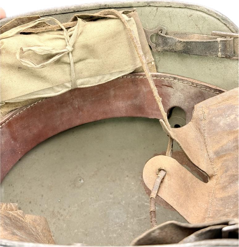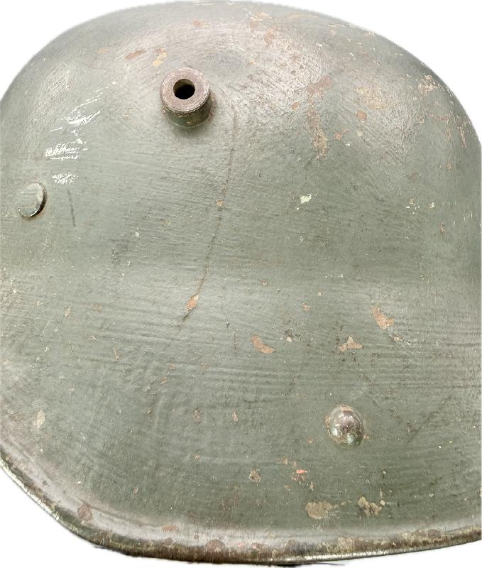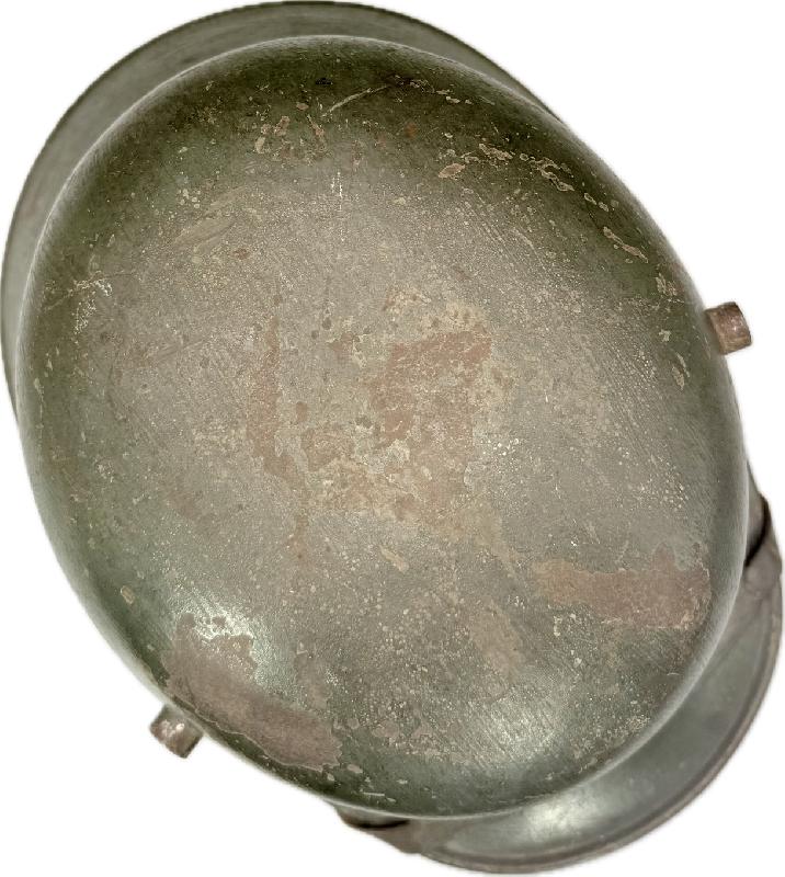 Casque nature, dans son jus, avec peinture typique des premières fabrications en vert clair brillant à l'intérieur, et repeint au pinceau sur l'extérieur en feldgrau mat, quelques traces d'usage et légère rouille (voir photos).