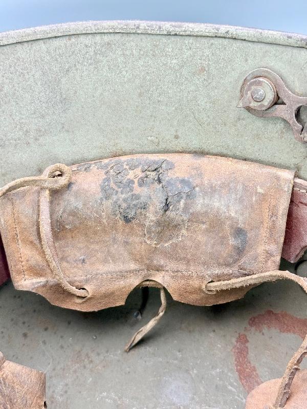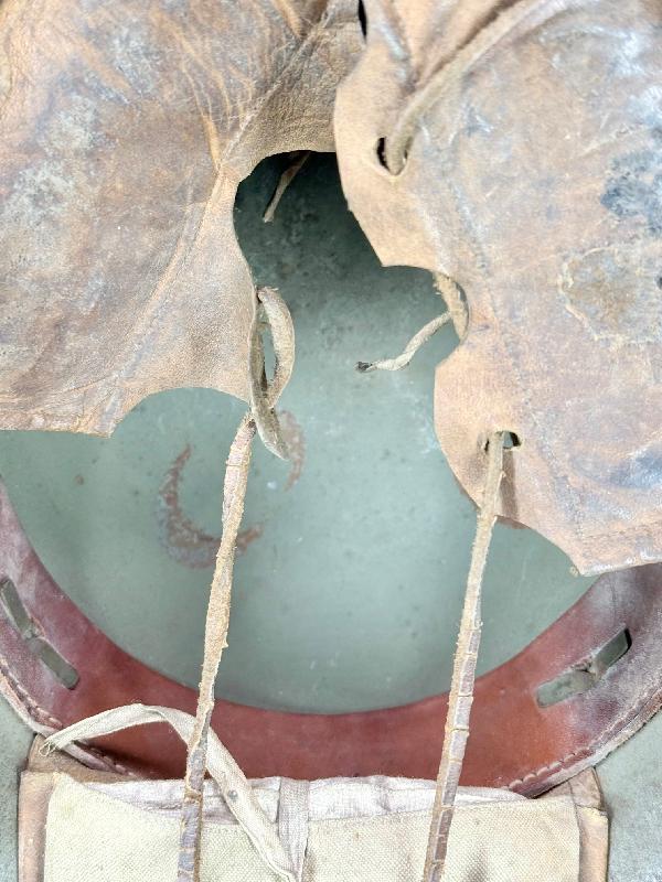 Belle coiffe en cuir fauve complète, avec ses coussins de crin; un des coussinets cuir a perdu ses deux dents de loup et le soldat l'a retercé plus haut pour passer le lacet de serrage. Jugulaire en fer modèle 1915 authentique.