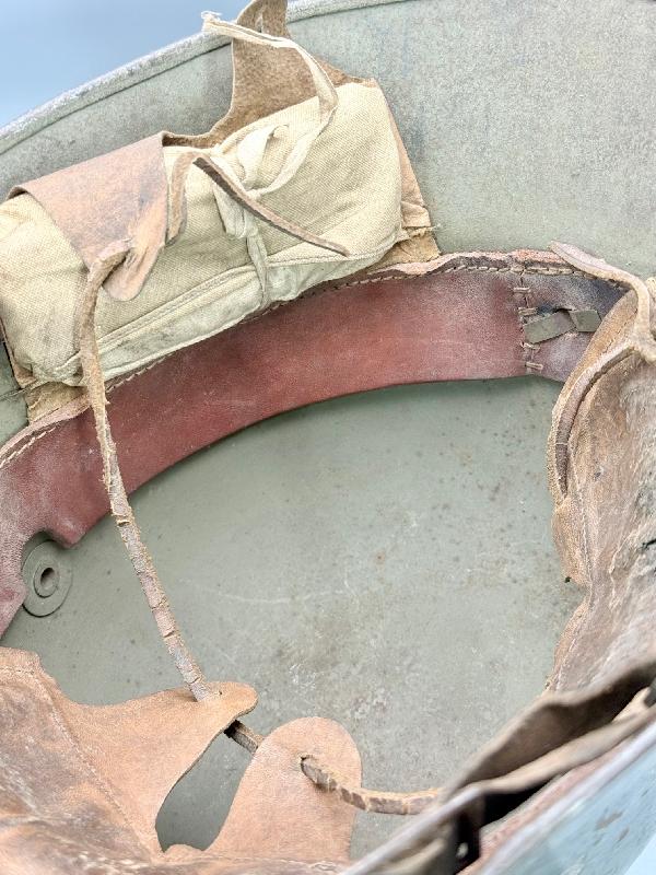 Casque d'acier modèle 1916 avec coiffe et bandeau du 1ème type en cuir non renforcé; les toutes premières fabrications.