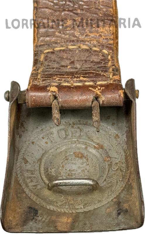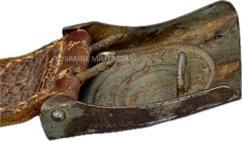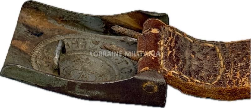 BOUCLE DE CEINTURON TROUPE PRUSSE FER FELDGRAU DATEE 1915 DU IR 87 Belle boucle prussienne modèle 1915 en peinture feldgrau avec sa patte cuir.