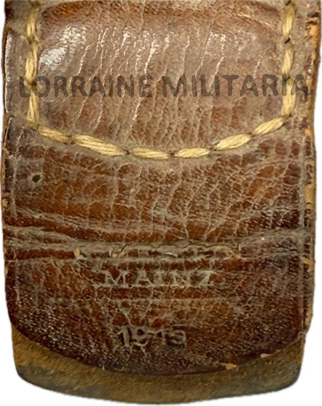 Celle-ci est en bon état, avec une belle patine. Elle est bien marquée du fabricant à Mainz, et datée 1915. De l'autre coté de la patte en cuir, il y a le marquage du 87ème régiment d'infanterie (87 R). Ce régiment fait parti du XVIII ème corps d'armée hessois et était stationné à Mainz.