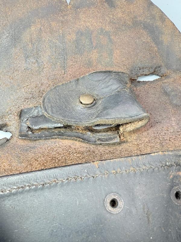 Celui-ci est en cuir noir, il est en état moyen, 2 trous d'usure sur le rabat supérieur, logement de la clé dans le rabat très abimé. Reste de tampons illisibles. VOIR PHOTOS