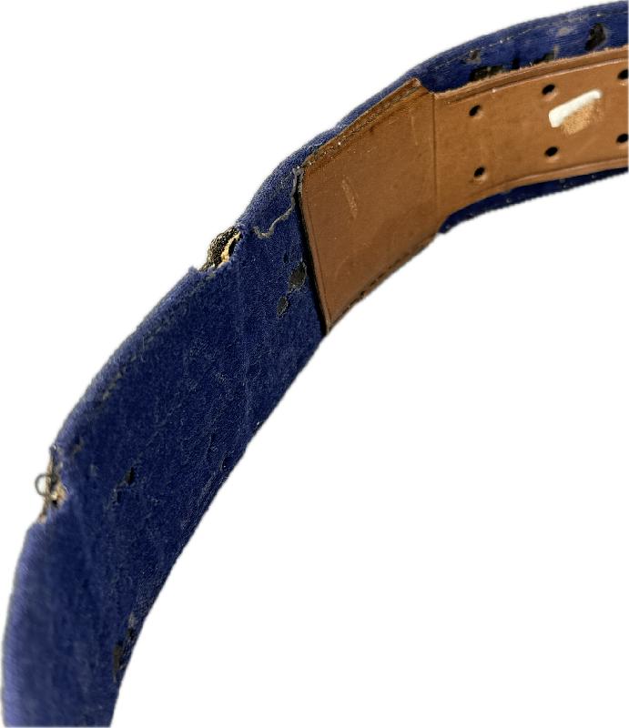 Celui-ci est en état moyen, des trous de mites sur la laine bleue (voir photos). Belle boucle blanche nickelée (régiments blancs), manque les deux passants, attache réglable de la boucle en aluminium.