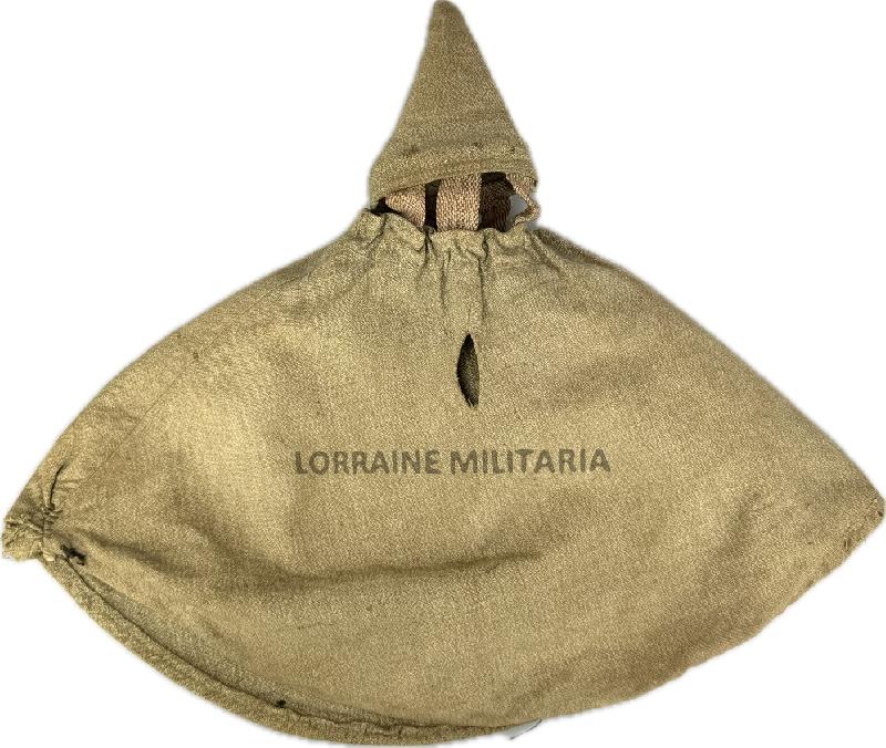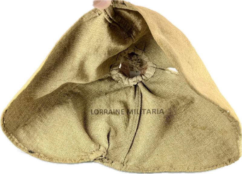 Il s'agit d'un modèle sans crochets de fixation mais avec ficelle sur le pourtour (variante que l'on rencontre moins souvent). Il est en bon état général, quelques taches anciennes, légèrement rétréci sur les deux cotés par pincement de la toile et cousue (pour le mettre à la taille d'un casque).