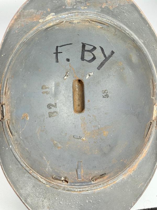 Il manque la coiffe ainsi que la jugulaire. Celui-ci a été repeint en gris artillerie foncé au dessus du bleu horizon clair à l'époque.