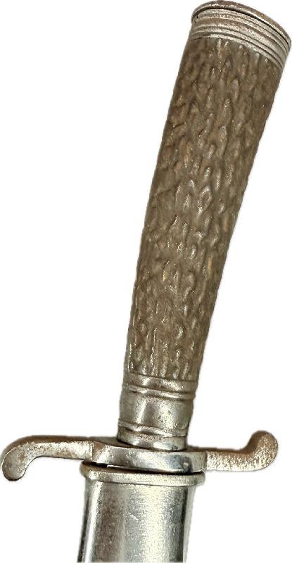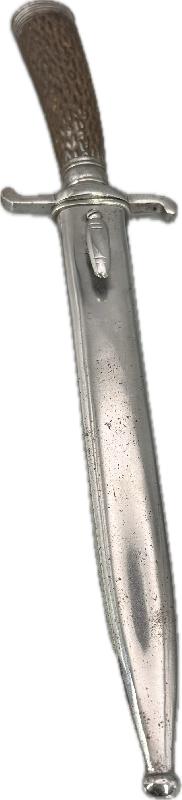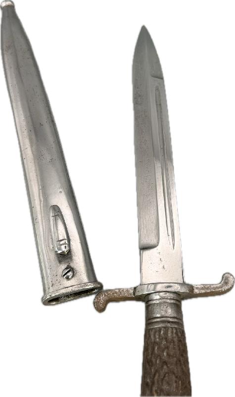 COUTEAU COMBAT ALLEMAND TYPE CHASSE MANCHE TOLE IMITATION CORNE Couteau de combat type chasse avec un manche en tôle imitation bois de cervidé.