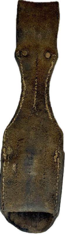 Cuir marron sale, en bon état général, rien de cassé, rivets en laiton (il en manque un réparé à l'époque par un renfort en fil, voir photo.