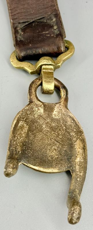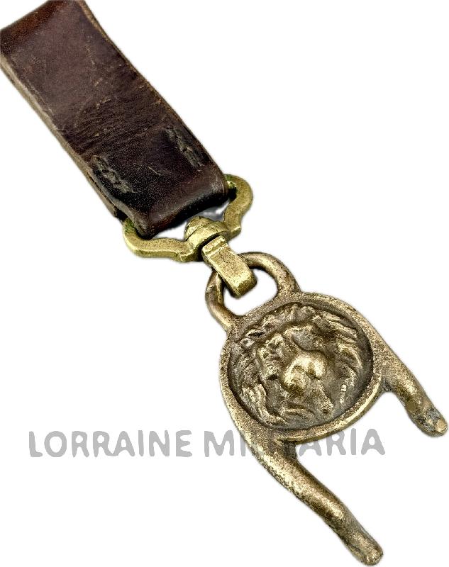 PORTE TAMBOUR ALLEMAND HESSOIS MODELE LAITON Porte tambour hessois en laiton, complet avec passant cuir de fixation. L'emblème de la Hesse (lion) possède une finition brut de fonderie. Bon état général. .