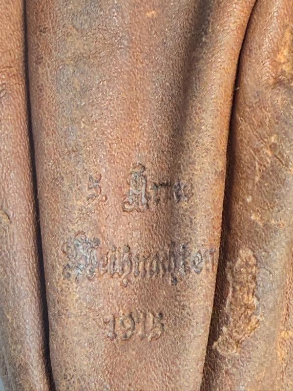 BLAGUE A TABAC ALLEMANDE CADEAU NOEL 1915 5ème ARMEE Blague à tabac en cuir avec le monogramme du kaiser Wilhelm II sur la face avant et sur l'arrière il y a écrit "5ème armée, Noël 1915".