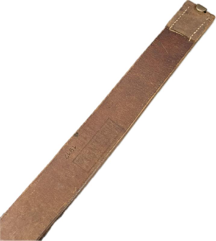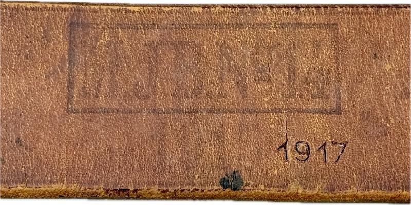 Celui-ci est complet, en bon état, le cuir est souple mais impossible de le bouger sur la boucle. Il est bien marqué du fabricant et daté 1915, régimenté au Mecklembourg Jager Bataillon 14 et frappé à froid en dessous 1917. Ceinturon destiné à un conducteur de charriot par exemple.