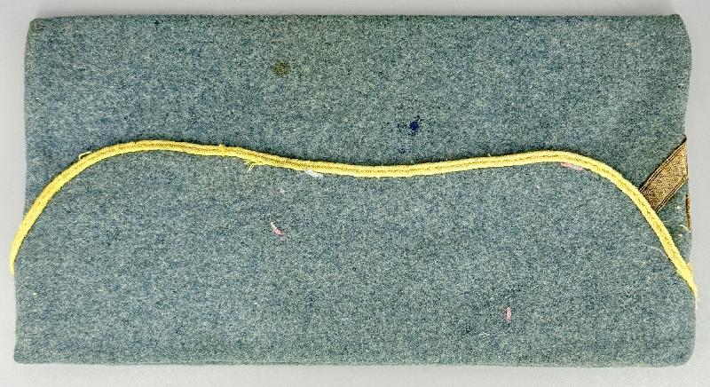 Passepoil, liseré jonquille abimé par endroits , des traces d'usage et usures sur le drap, quelques minuscules trous de mites.