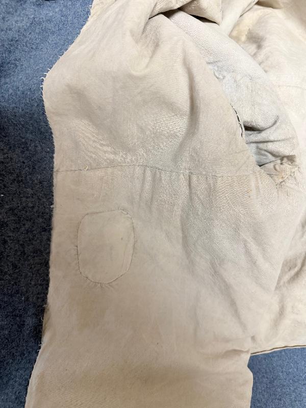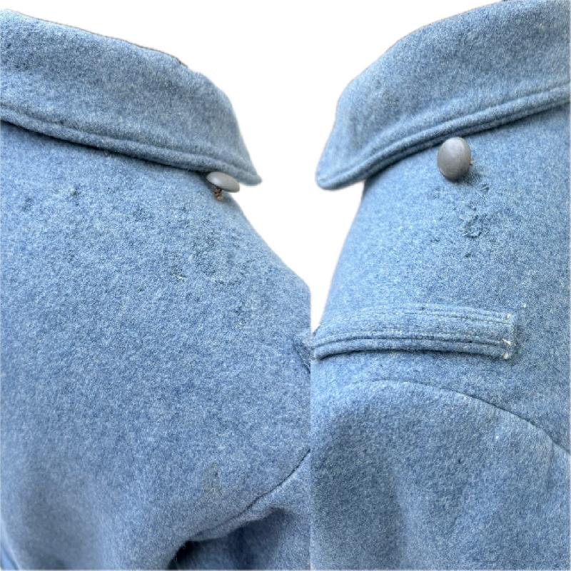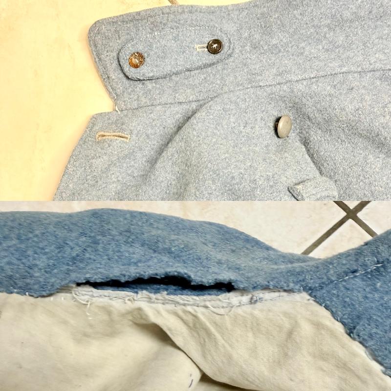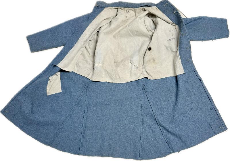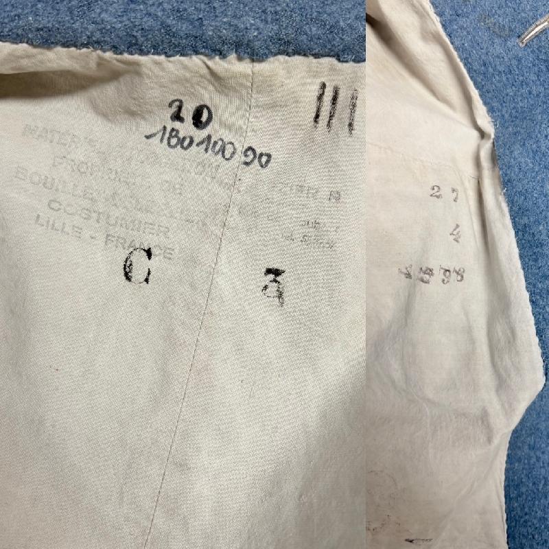 Capote en bon état général, quelques petits trous de mites réparés anciennement, quelques léchures sur le drap mais vraiment infimes. Dans l'ensemble, elle est en bon état. Dans sa longueur d'origine, pas recoupée, présence de la poche à pansement; marquages anciens de costumier, pas de tampon de réception. Le col est un peu décousu à l'intérieur au niveau de la doublure et il manque la patte de support du ceinturon (voir photos).