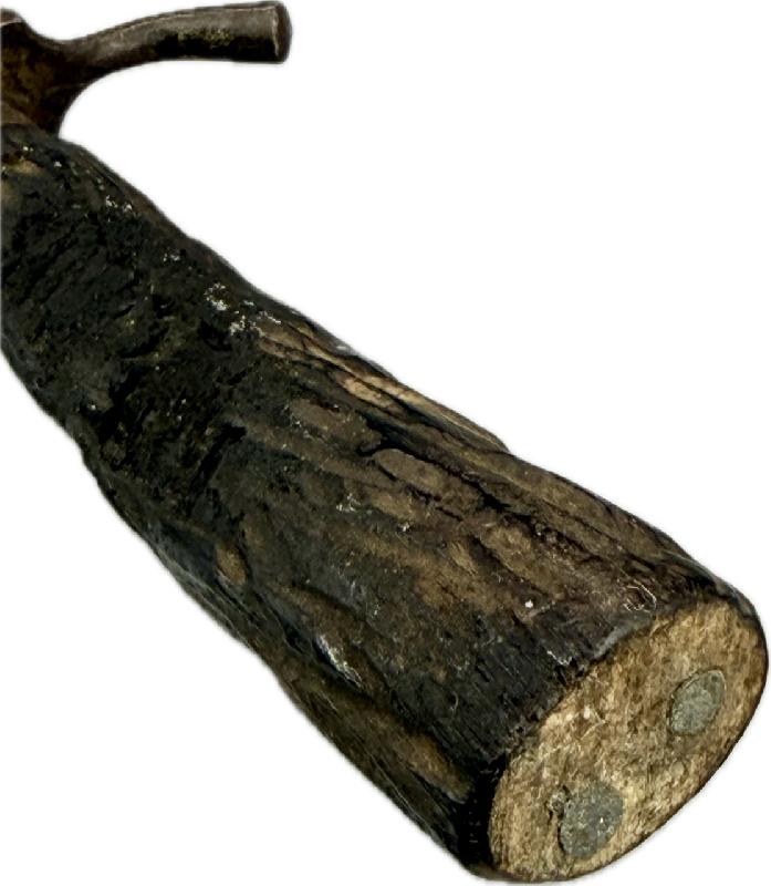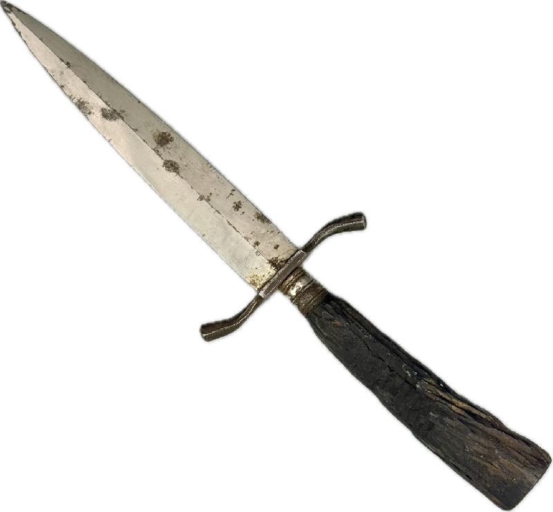 Le manche en bois est brulé sur l'arrière du couteau (voir photos), belle lame avec gravure dans sa longueur d'origine, traces de rouille par endroits sur celle-ci et près de la pointe (voir photos).