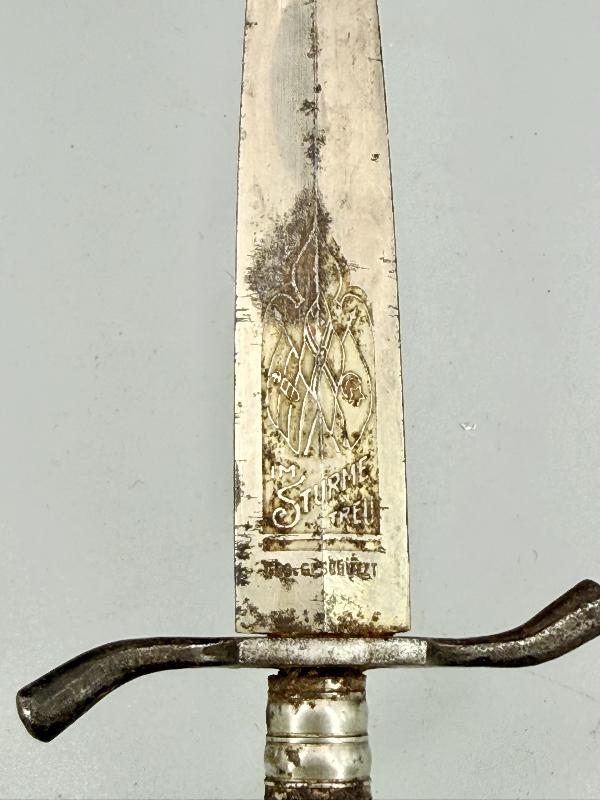 COUTEAU COMBAT ALLEMAND TYPE CHASSE LAME GRAVEE IM STURME TREU SANS FOURREAU Couteau de combat type chasse avec manche en bois imitation corne de cervidé, lame gravée avec drapeaux et devise "IM STURME TREU".
