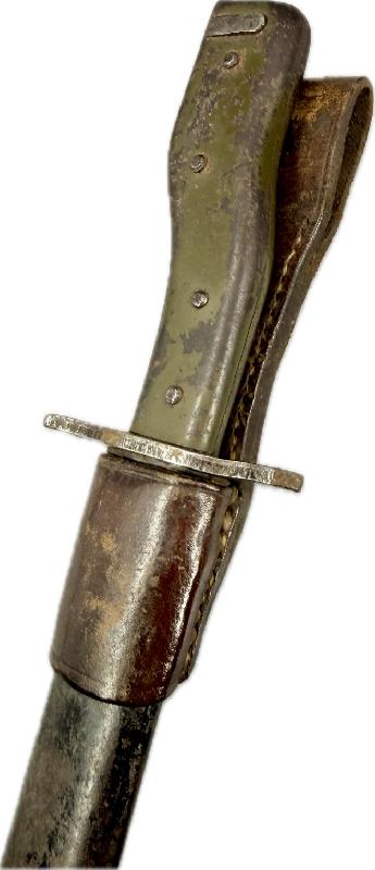 COUTEAU COMBAT ALLEMAND DEMAG COMPLET Couteau de combat du modèle Demag, il est complet avec son fourreau qui a subi une modification avec ajout d'un porte fourreau cuir sur mesure. Modification pour un sous-officier ou officier?