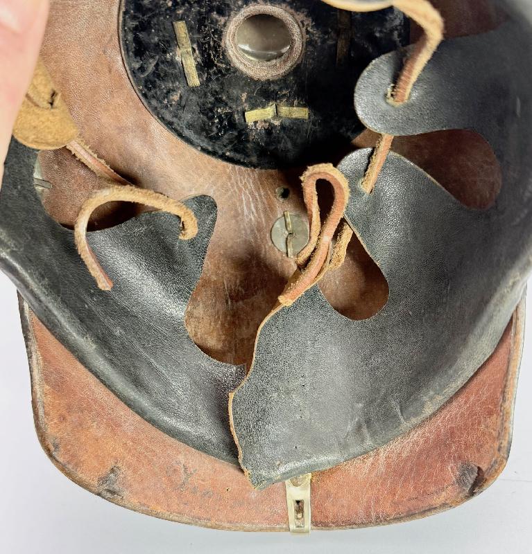 Coiffe complète en bon état, pas de marquages apparents mis à part la taille (55) et présence de nom d'un soldat.