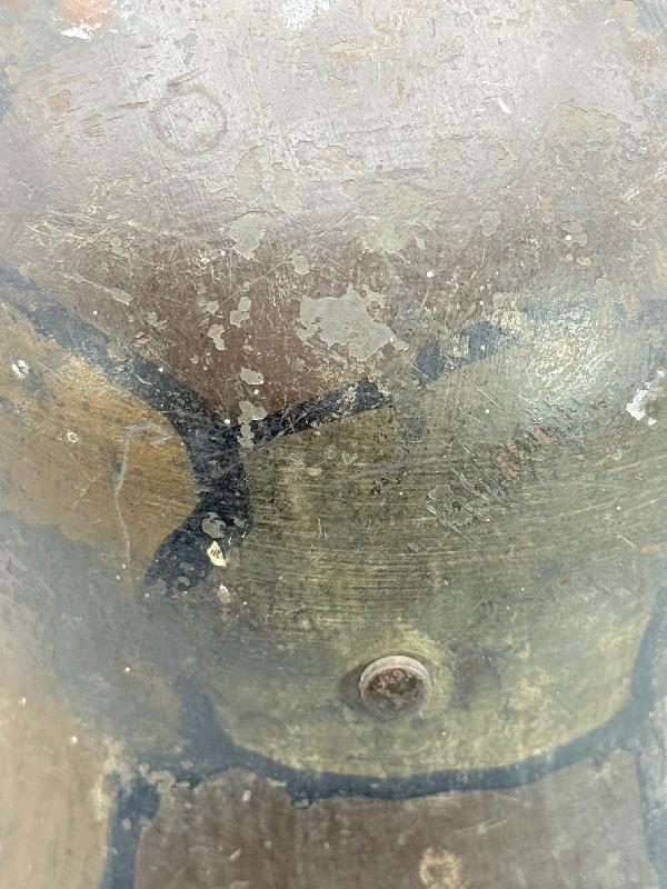 Casque nature mais qui a subi les affres de la guerre puisqu'un tourillon extérieur a été arraché sur le coté gauche.