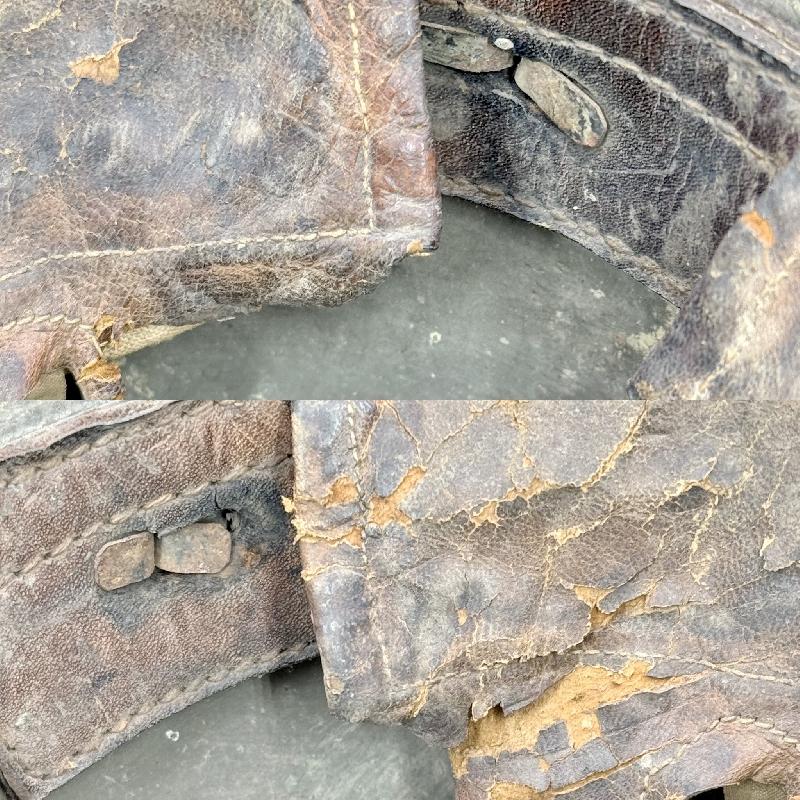 La coiffe est présente, n'a jamais été touchée, démontée mais elle est en état moyen et est fragile. Un des 3 coussins de cuir est arraché du bandeau mais il est encore là. Ceux-ci sont vides de leur coussin de crin.