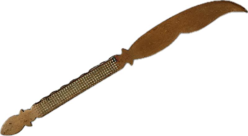 ARTISANAT TRANCHEE FRANÇAIS COUPE PAPIER CEINTURE OBUS VERDUN 1916 Coupe papier fait à partir d'une ceinture d'obus en cuivre.