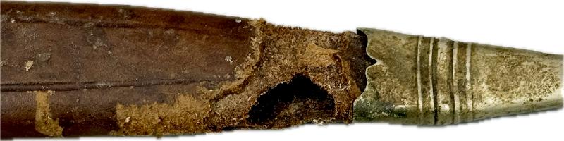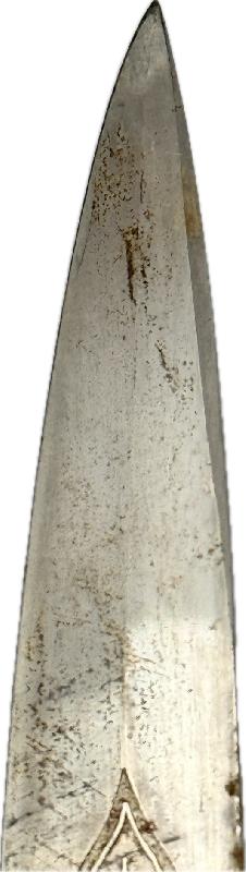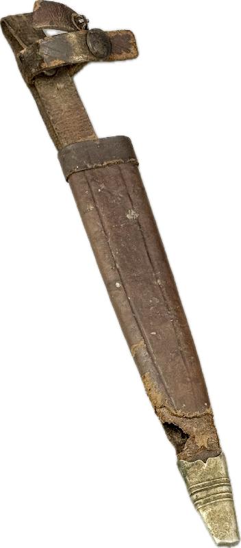 Il est dans son jus, pas nettoyé, très belle lame non touchée dans sa finition d'origine, manche en bois imitant la corne de cervidé, garde en S avec une légère oxydation du coté de la gravure (voir photos). Fourreau en cuir au modèle qui a malheureusement été grignoté sur le bas par un rongeur; mais rien n'est cassé ou manquant.