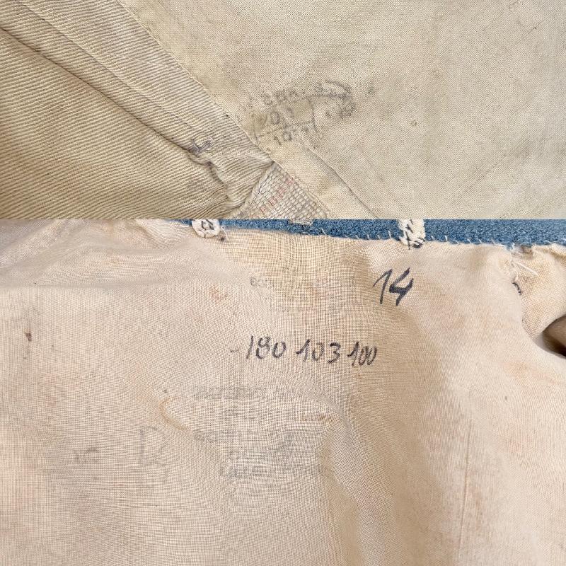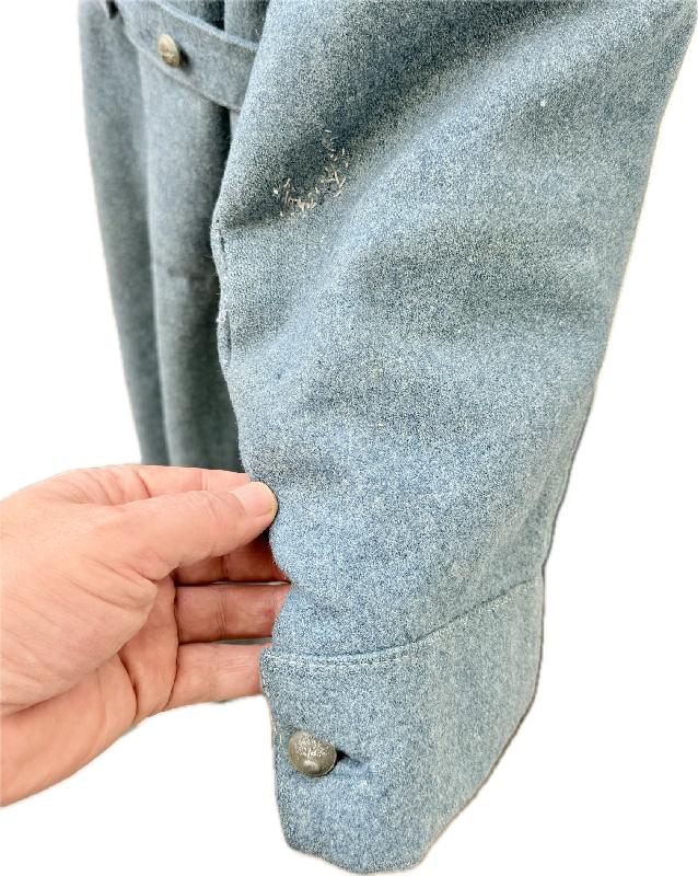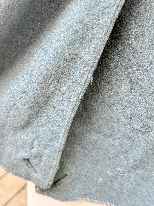 Elle est en bon état général, des traces d'usures, quelques légers trous de mites (voir photos), anciennes réparations sur des accrocs (les coudes et l'arrière du manteau). Une des manches est usée sur le bas, avec la laine qui s'est découpées sur quelques centimètres. Les deux manches sont un peu décousues sur l'arrière (voir photos).