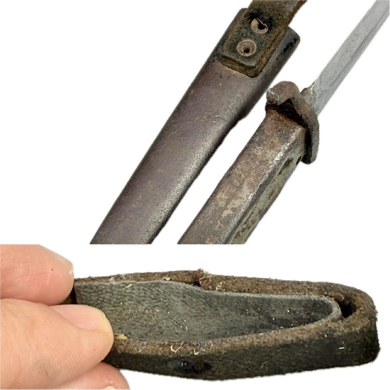 Fourreau avec oxydation, manque la pièce en cuir permettant de verrouiller le couteau sur celui-ci; une pièce en cuir collée à l'intérieur du passant de ceinturon car celui-ci était cassé (voir photos).
