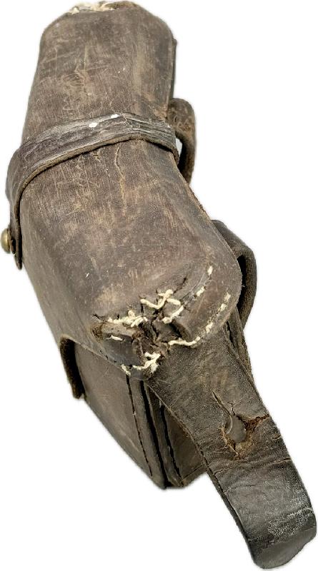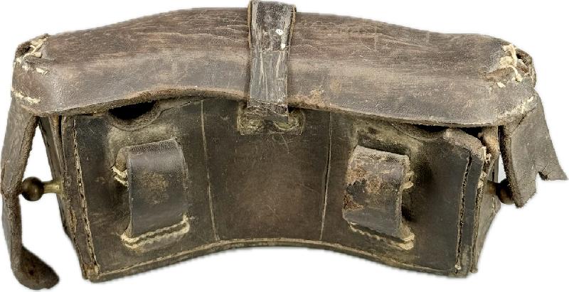 Celle-ci sort de grenier, elle est dans son jus, à nettoyer. Il y a des coutures renforcées par endroits, travail d'époque, un des passants latéraux de fermeture est cassé. Elle a subi à l'époque une transformation par l'ajout d'une patte de fermeture sur le rabat supérieur, modification réglementaire car la cartouchière fermait mal.