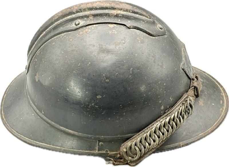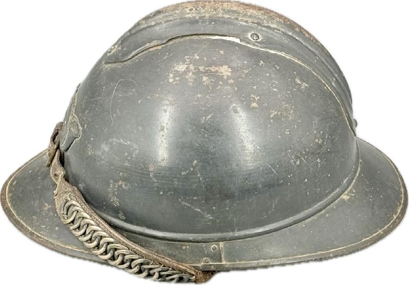 Casque dans son jus, monté avec une jugulaire d'officier en cuir avec chaînette de cavalerie.