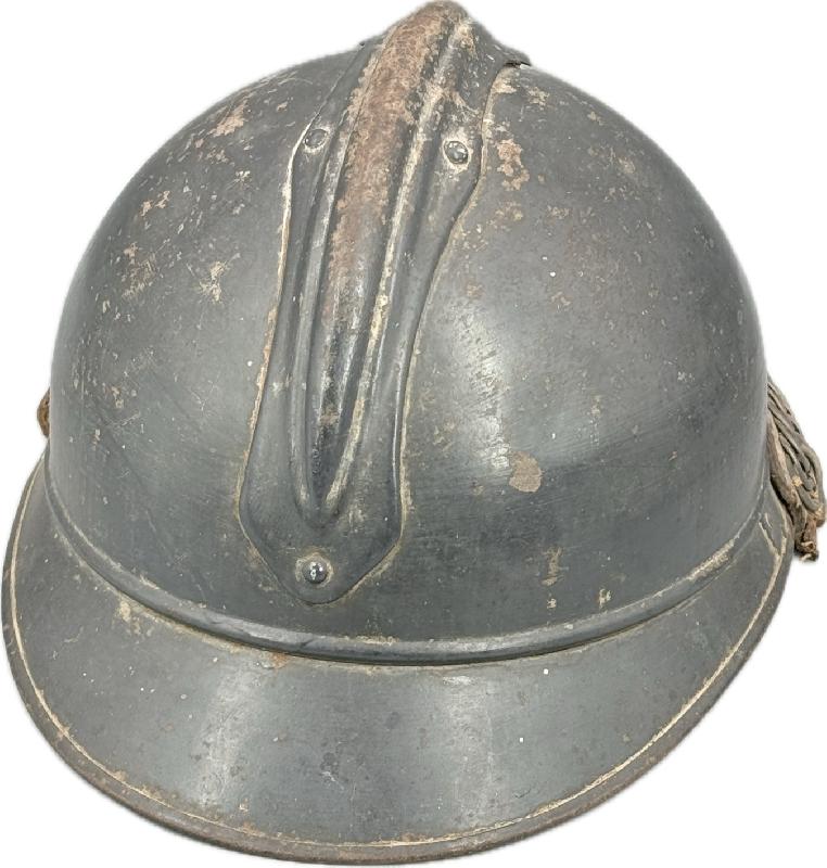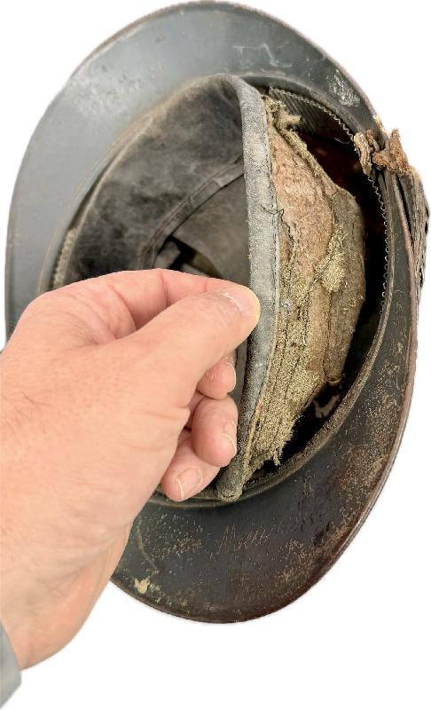 Peinture bleu horizon encore bien présente, coiffe en cuir abimée, avec le bandeau de laine qui a été mité fortement sur un des cotés, il ne tient plus sur le casque sur un coté. (voir photos).