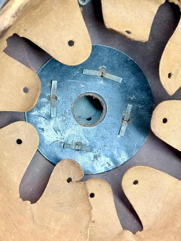 Belle bombe en cuir vernie non déformée, coiffe en cuir fauve avec marquage du fabricant dans la nuquière et daté 1915. Il manque l'écrou de fermeture sur le jonc arrière. Bonne pointe fer à baïonnette.