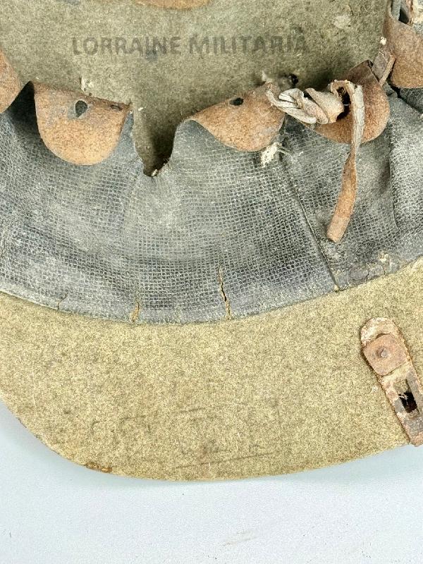 Il ne possède plus sa jugulaire et les cocardes, bombe repercée à l'époque (voir photo), très certainement lors d'un passage en atelier de réparation.