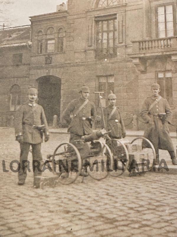 Lorraine Militaria CP PHOTO GROUPE DE MITRAILLEURS  ALLEMANDS  MG 08 SUR RARE CHARRETTE A MAIN