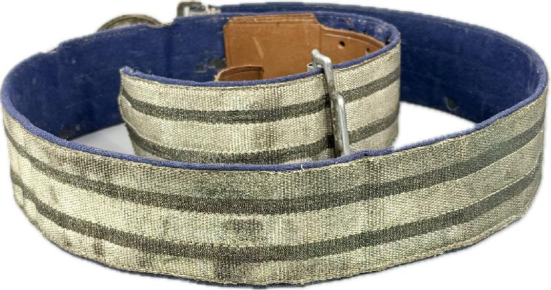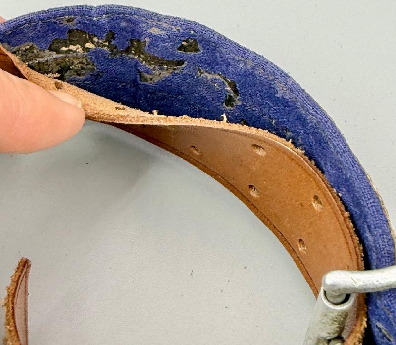 Celui-ci est en état moyen, des trous de mites sur la laine bleue (voir photos). Belle boucle blanche nickelée (régiments blancs), manque les deux passants, attache réglable de la boucle en aluminium.