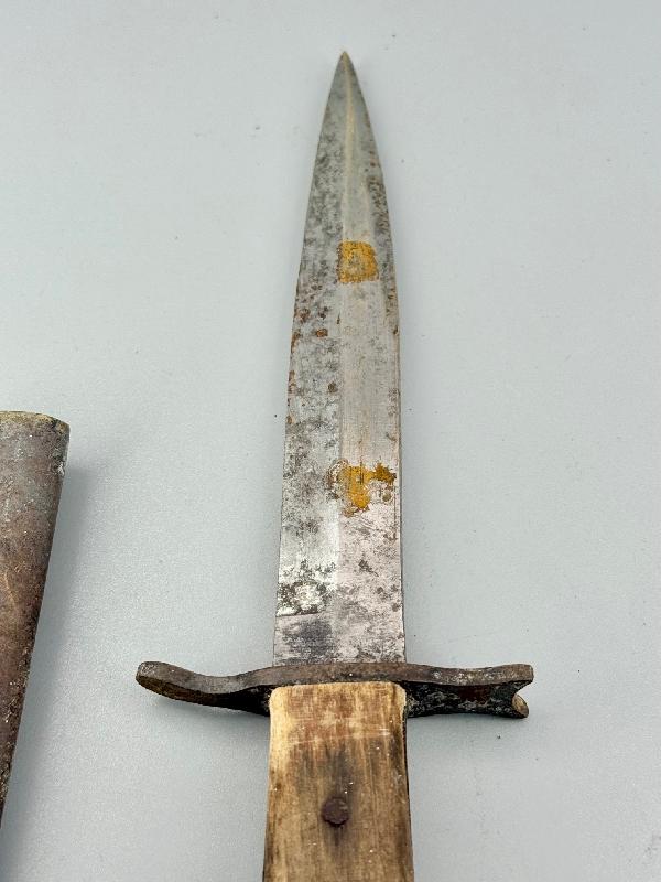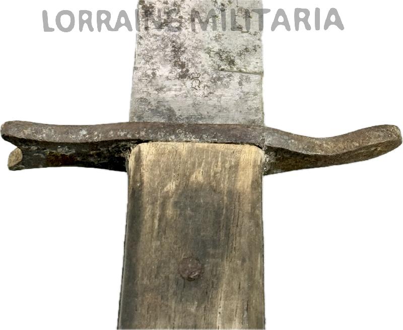Celui-ci sort de grenier, corrosion légère sur l'ensemble extérieur du couteau. Il n'y a plus d'attache sur le fourreau. Manche bois complet, garde typique de chez Demag. Lame légèrement sale mais en très bel état, pas de fabricant, mais poinçon impérial.