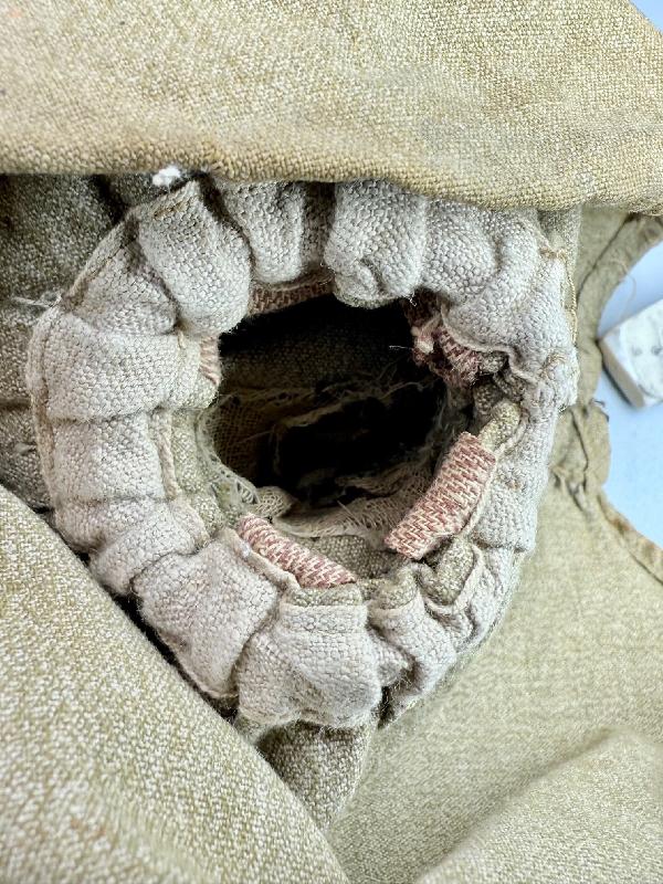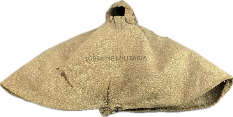 Il s'agit d'un modèle sans crochets de fixation mais avec ficelle sur le pourtour (variante que l'on rencontre moins souvent). Il est en bon état général, quelques taches anciennes, légèrement rétréci sur les deux cotés par pincement de la toile et cousue (pour le mettre à la taille d'un casque).
