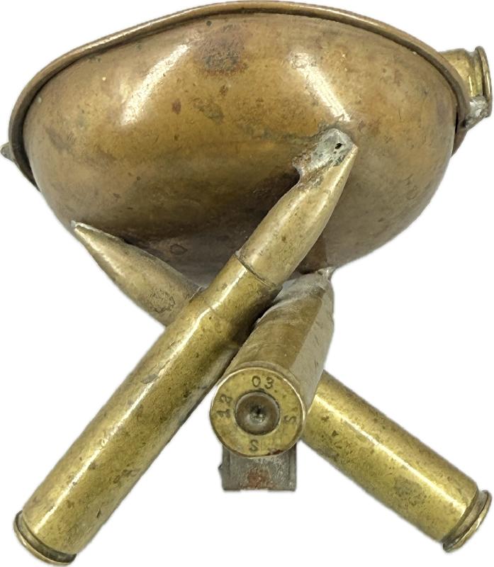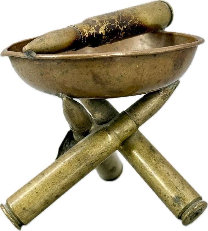ARTISANAT DE TRANCHEE ALLEMAND CENDRIER EN LAITON Cendrier artisanal en laiton avec cartouches (inertes) de 7,92, il y a également une patte d'épaule en tôle qui malheureusement a perdu sa peinture.