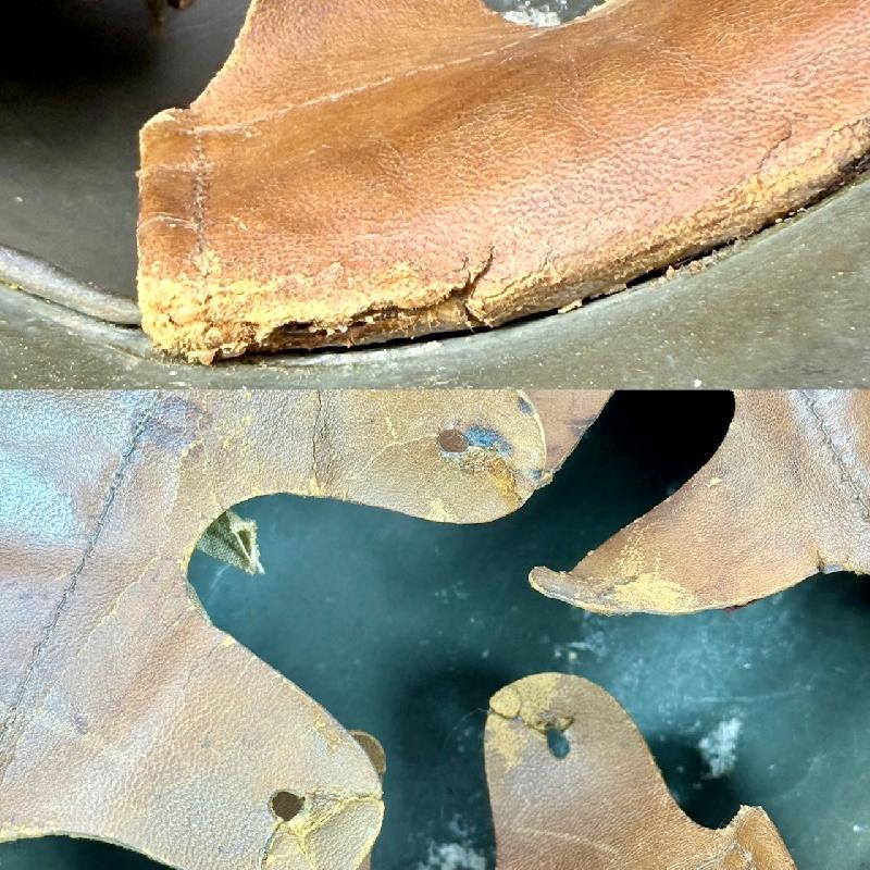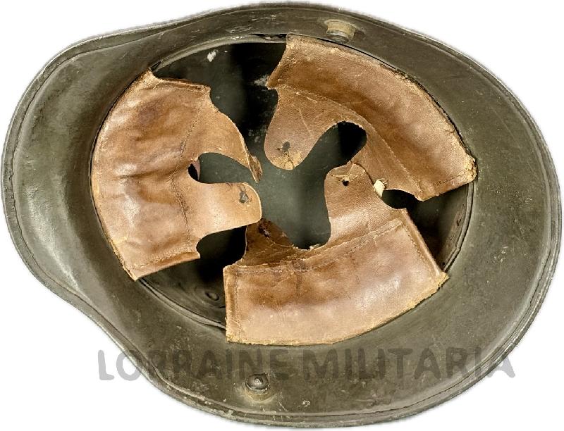 Belle coiffe complète avec ses coussinets en cuir brun qui sont montés sur bandeau métallique. Il y a des traces de col au bout des dents de loups, là ou il y a le cordon de serrage qui passe; certainement déchirés et réparés par de la colle (voir photos).
