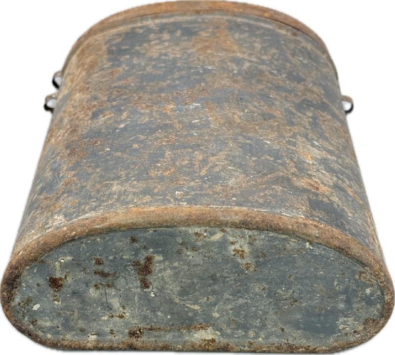 BOITE DE MASQUE A GAZ FRANÇAIS M2 DEMI-OVALE Boite en tôle pour masque à gaz M2, modèle demi-ovale.