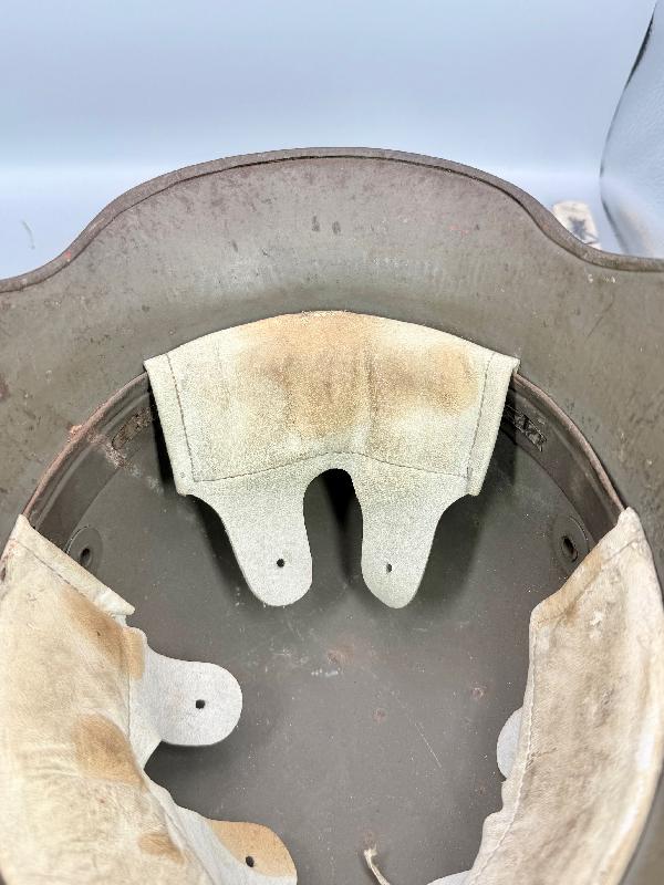 Casque complet avec sa coiffe en cuir blanc montée sur cerclage métallique typique des fabrication fin de guerre. Il est en très bel état, avec une belle peinture feldgrau, la coiffe est en excellent état; celle-ci possède 2 coussins de crin (il en manque un, voir photos). Bien marqué AK et taille 66.