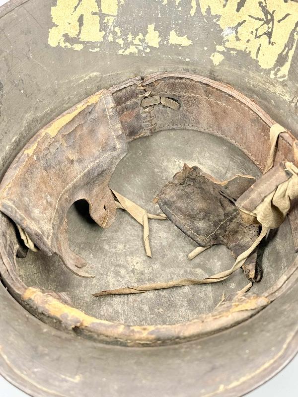Casque nature mais qui a subi les affres de la guerre puisqu'un tourillon extérieur a été arraché sur le coté gauche.