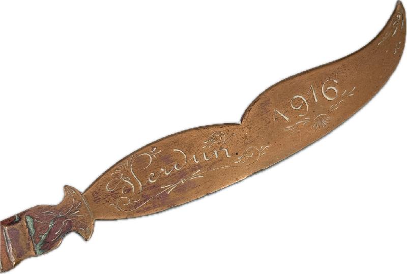 ARTISANAT TRANCHEE FRANÇAIS COUPE PAPIER CEINTURE OBUS VERDUN 1916 Coupe papier fait à partir d'une ceinture d'obus en cuivre.