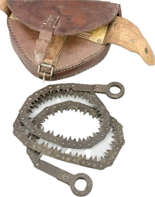 Bel étui cuir, complet, aucun manque ou casse. Celui-ci n'est pas marqué d'un fabricant. A noter un petit trou sur une des languettes de fermetures des outils d'entretien (voir photos). Scie articulée en tôle complète, il manque les manches en bois dans l'étui.