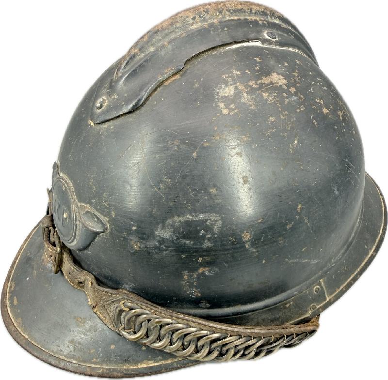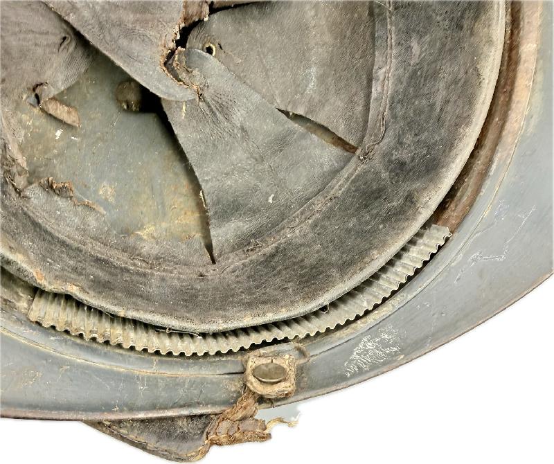 Casque dans son jus, monté avec une jugulaire d'officier en cuir avec chaînette de cavalerie.